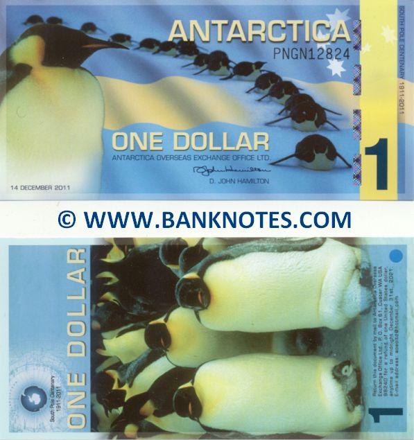 1 Dollar 14.12.2011 (Front: Penguins sliding down hill. Flag of Antarctica. Back: Emperor Penguins. South Pole Centenary 1911-2011. Main colours: Blue and yellow. Date of Issue: 14 December 2011. Watermark: None. Signature: Dave John Hamilton. Printer: British American Bank Note Company)