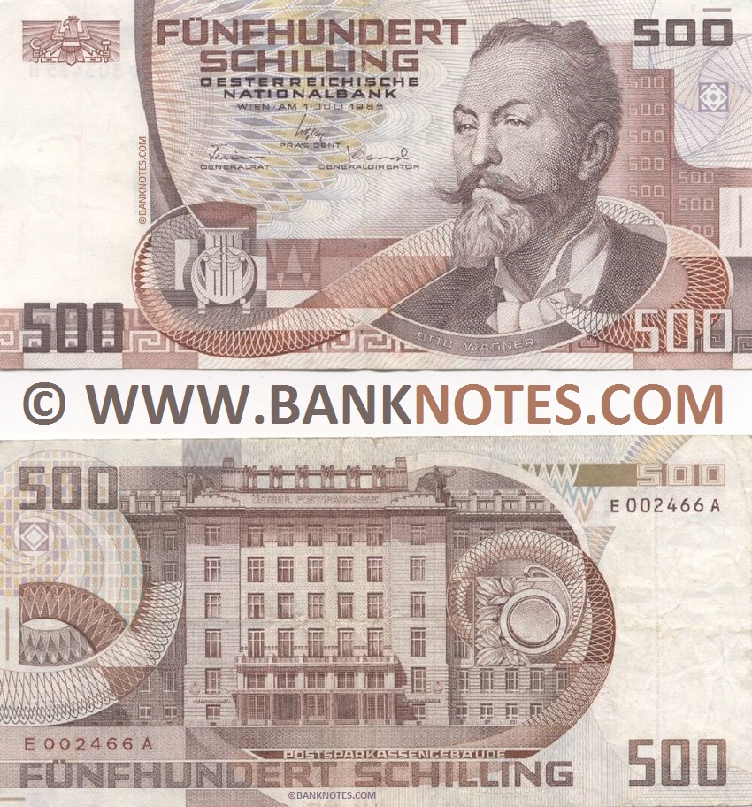 500 Schilling 1.7.1985 (© Front: Portrait of Austrian architect Otto Wagner (1841–1918). Ornate columnar pedestal. Stylised Bundeswappen – Austrian coat of arms. Back: Building of the Postal Savings Bank (Postsparkassengebäude) in Vienna, designed and built in Art Nouveau style by Otto Wagner. Watermark: Stylized Bundeswappen. Designer: Robert Kalina (1955–). Predominant colour: Red brown. Signatures: Dr. Stephan Koren (Präsident, 1978–1988); Heinrich Treichel (Generalrat); Dr. Heinz Kienzl (Generaldirektor). Issuer: Austrian National Bank. Date of issue: 1 July 1985. Circulation from: 1986. Demonetized: 28 February 2002. Legal tender: Exchangeable into Euros at OeNB (NBA) indefinitely. Material: Cotton paper. Printer: Oesterreichische Banknoten- und Sicherheitsdruck GmbH (OeBS) ©) (Serial # E 662247 B) (circulated) VF