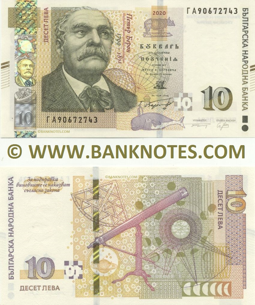 circle underneath. Watermark - a half-tone image of the portrait from the banknote and contrasting initials BNB" (new element). Security thread (new design) - a metallized strip woven into the paper with a minitext BNB 10", partially showing through on the reverse side of the banknote, changing colour from green to red at a different viewing angle, when observed through a polarized filter, tilted black and white stripes can be seen on the reverse side of the banknotes security strip. See-through register as the banknote is held against the light, the figure 10 appears within a rectangular chequered field. Hologram stripe with optical effects images of the earth globe, a telescope, and a planet, alternating when the banknote is tilted; a coloured hologram portrait of Dr. Petar Beron; a stylised image of an armillary sphere; images of a crowned lion rampant with a dynamic effect and a 3D image of the number 10. Micro-print on the obverse horizontal lines with the texts PETAR BERON and 1799 1871 in the background to the left of the portrait; two vertical lines to the right of the portrait with the text PETAR BERON; the text 10 LEVA filling up the number 10; 10s forming a strip under the year of issue 2020. Micro-print on the reverse the text PETAR BERON forming a vertical strip in the left side of the banknote. Fluorescence on the obverse under UV light (365 nanometres), to the right of the hologram stripe appears a strip, fluorescent in red, composed of repeating 10s and globe images; the two serial numbers, the right half of the background elements, the see-through register and the signatures of the Governor and the Chief Cashier fluoresce in green. Fluorescence on the reverse under UV light (365 nanometres), the telescope and parts of the illustrations in the academic works fluoresce in red; Dr. Petar Berons portrait fluoresces in blue, and a globe and two 10s fluoresce in yellow-green. Hidden image (new element) at a viewing angle of 15-20 degrees, the words 10 LEVA appear on the right of the holographic stripe. |