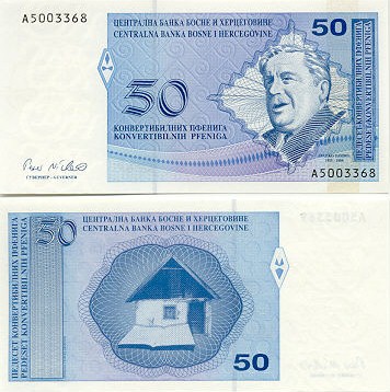 Texts: Centralna Banka Bosne i Hercegovine. Централна банка Босне и Херцеговине. Pedeset konvertibilnih pfeniga. Педесет конвертибилних пфенига. Fifty convertible pfenigs. Бранко Ћопић.