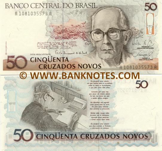 50 Cruzados Novos (1989) (Front: Poet Carlos Drummond de Andrade; manuscript of a poem "Prece de Mineiro no Rio"; houses and mountains of Itabira, his birthplace and residence; Back: Carlos Drummond de Andrade writing at his desk; Watermark: Republic (Liberty head); Printer: Casa da Moeda do Brasil)