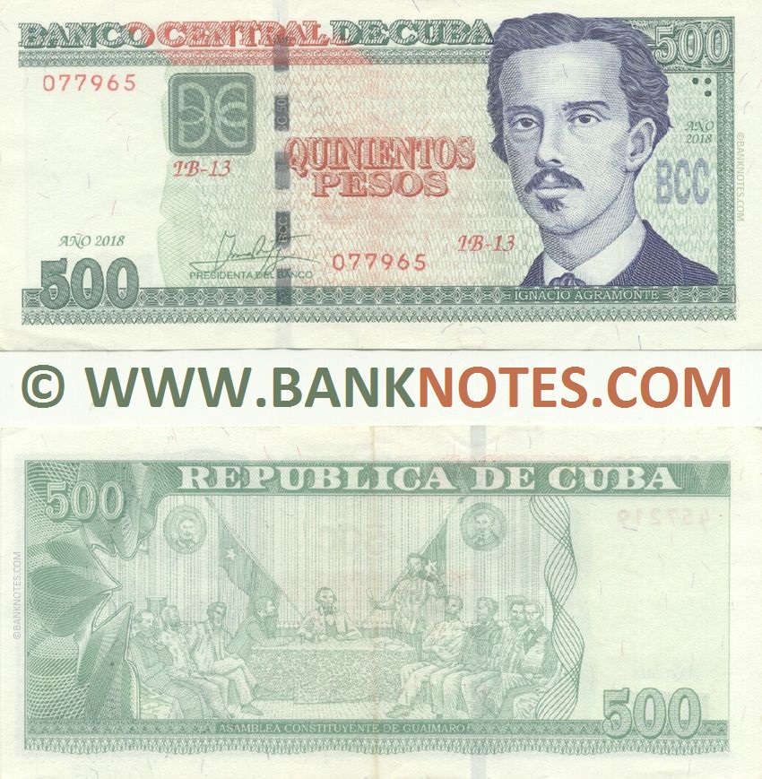 500 Pesos 2018 (Ignacio Agramonte y Loynáz; Constituent Assembly, Guáimaro. Predominant colours: Green and orange. Watermark: Celia Sánchez Manduley; Electrotype '500'. Sig.24: IMM Castrillón. Printer: Impresos de Seguridad, Havana, Cuba)