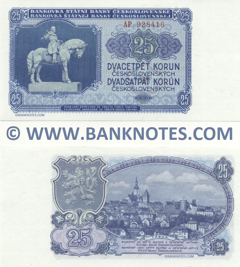 25 Korun 1953 (Front: Equestrian Statue of Jan Žižka from Trocnov, on Vítkov Hill in Prague, unveiled in 1950 (sculptor Bohumil Kafka). Back: Jan Žižka square in Tábor, Czechia. Watermark: Pattern of stars within connected circles. Security features: Watermarked paper. Consecutively running red horizontal serial number on the obverse side of the banknote. Predominant colour: Blue. Artist: Sergey Akimovich Pomanskiy (Сергей Акимович Поманский). Signature: None. Printing method: Offset. Issuer: State Bank of Czechoslovakia. Date of Issue: 1 June 1953. Withdrawal: 31 December 1962. Material: Cotton paper. Printer: Goznak, Moscow, Soviet Union)