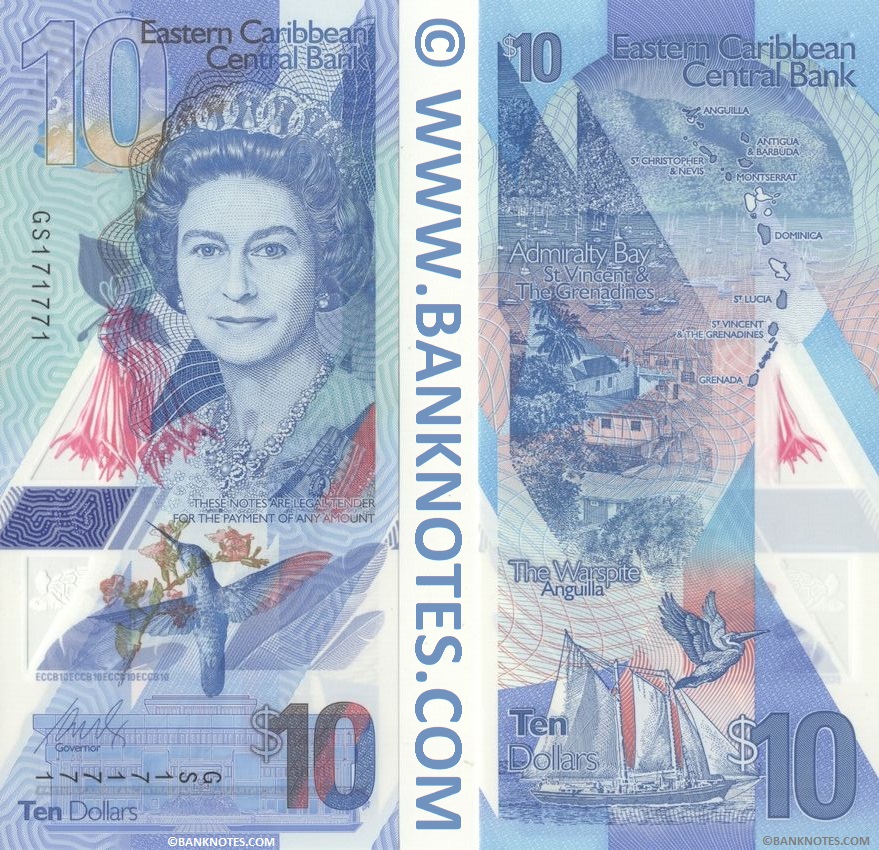 10 Dollars (2019) (Obverse: Effigy of the Queen Elizabeth II wearing a crown. Fish. Hanging blossoms of a Fuchsia fulgens flower. Green-throated carib (Eulampis holosericeus) hummingbird and Petunia flowers. Turtle in the see-through window. Eastern Caribbean Central Bank building (Basseterre, St. Kitts). Reverse: Map of the Eastern Caribbean. Coastal scene of the Admiralty Bay on the island of Bequia (Grenadine islands) with houses, yachts, boats and palm trees. Brown pelican (Pelecanus occidentalis). The Warspite sailing ship, Anguilla. Shadow image: N/a. Security features: Consecutively running black horizontal and vertical serial numbers on the obverse of the banknote. Monogram "ECCB", denomninational block "10" (front) and parts of the design (back) fluoresce while being exposed to ultraviolet light. Tactile feature: There is an X-shaped arrangement of impressed thirteen dots in the top left corner of the obverse to enable physical identification of the note for the visually impaired and the blind people. Main colour: Blue. Issuer: Eastern Caribbean Central Bank. Artist: De La Rue. Engraver: De La Rue. Signature: Timothy N.J. Antoine (Governor, 1-Feb-2016–). Date of Issue: 29 May 2019. Material: Safeguard® polymer plastic substrate (Biaxially oriented polypropylene). Printing method: Intaglio. Printer: De La Rue, Basingstoke, England (TDLR))
