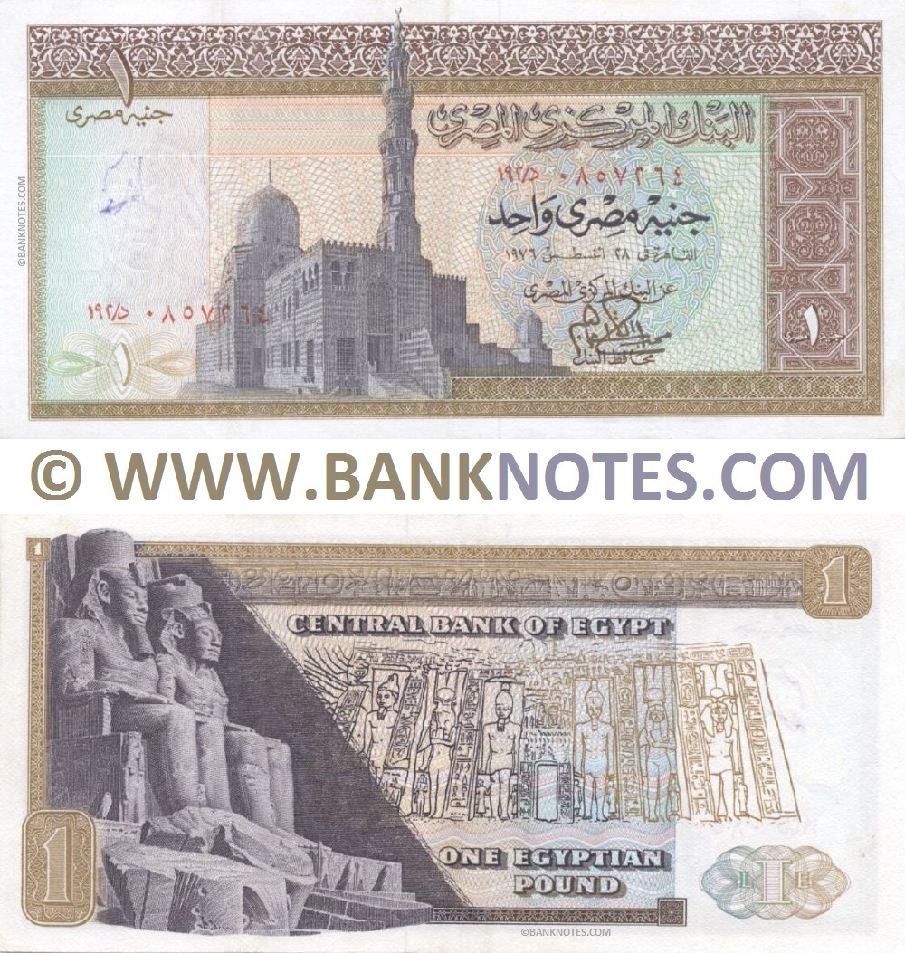 1 Pound 9.4.1978 (Front: Sultan Qait Bay (Qayitbay) Mosque (Madrasa of Qaytbey) in the Mamluk Cemetery. Back: Two statues of seated pharaoh Ramsis II (Ramses II, Ramesses II) as part of the façade and entrance of the Great Temple of Abu Simbel. On the right side of the note is a drawing of the façade of the Temple of Queen Nefertari at The Small Temple of Abu Simbel after relocation. A band with Egyptian hieroglyphs. Watermark: Head of The Seated archaic Egyptian Scribe, Fifth Dynasty of Egypt. Predominant colour: Brown. Artist: Pending. Engraver: Pending. Signature: Mohamed Ibrahim (CBE Governor, 19 March 1976 to 4 January 1982). Security thread: Solid, metallic, fully embedded, vertical, 0.5 mm wide. Printing method: Intaglio. Issuer: Central Bank of Egypt. Date of Issue: 9 April 1978. Total issue: Pending. Date of withdrawal: 1978/2011. Legal tender: No. Material: Cotton paper. Printer: The Printing House of the Central Bank of Egypt a.k.a. Egyptian Banknote Printing House (EBPH)) (Serial No: 268/D 0528659) (circulated) VF-XF