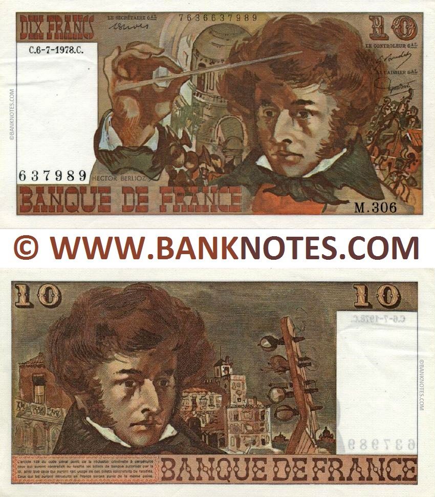 10 Francs C.6.7.1978.C. (Front: Louis Hector Berlioz (December 11, 1803 – March 8, 1869) - French Romantic composer, conducting his ´Requiem´ with an orchestra in the Chapelle des Invalides in Paris (Portrait painted by Émile Signol). Back: Hector Berlioz playing a guitar offered by Niccolò Paganini in front of Villa Medici in Rome; In the background, the Mausoleum of Hadrian, usually known as the Château Saint-Ange (Castel Sant'Angelo) in Rome and the St. Peter's Basilica (Basilique Saint-Pierre; San Pietro; Sancti Petri) in Vatican. Watermark: Profile portrait of Hector Berlioz (after the medallion sculpted by Jean-Pierre Dantanat at the Villa Medici in 1831). Security features: Watermark. Consecutively running, black, horizontal series and serial numbers on the obverse of the banknote. Raised ink. Use of multiple tones in a single dominant colour. Main colour: Orange ocher (ochre). Work by: Lucien Joseph Fontanarosa. Engraved by: Jacques Jubert (front) and Henri Renaud (back). Watermark engraved by Michel Valentini (BdF). Signatures: Gilbert Bouchet (Le Contrôleur G(énér)al, 1967–1979); Pierre Strohl (Le Secrétaire G(énér)al, 1976–1987); Jean-Jacques Tronche (Le Caissier G(énér)al, 1975–1979). Issuer: Bank of France. Dates of Issue: 23 November 1972 through 6 July 1978. Circulation from: 5 November 1974. Withdrawn: 31 December 1980 through 1 January 2002. Legal tender: No, from 15 September 1986. Demonetized: 17 February 2012. Material: Cotton paper fiber. Printing method: Dry offset in four colours (yellow, red, light blue and dark blue). Printer: Banque de France) (Series & Serial # M.306/7636637989) AU