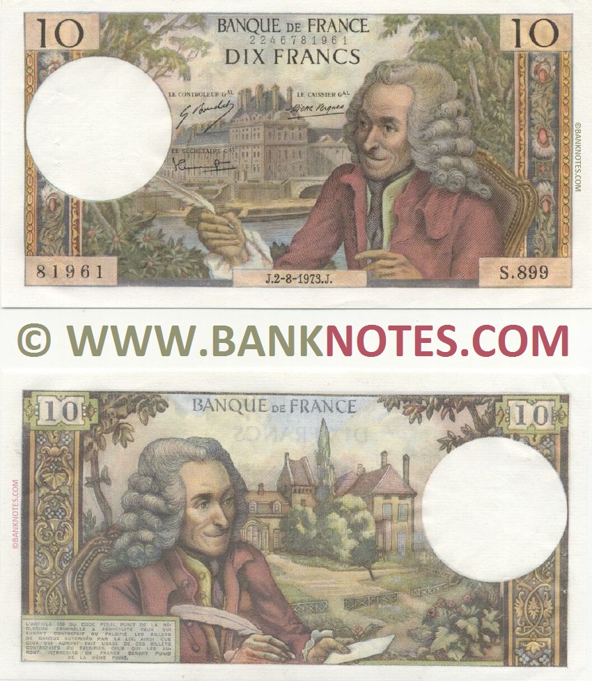 10 Francs V.4.1.1973.V. (Front: François-Marie Arouet de Voltaire (21st November, 1694 – 30th May, 1778) - French writer and philosopher - engraving by Dominique Vivant, baron de Denon. Palais des Tuileries in Paris engraved after the painting by François Raguenet as Voltaire could see from his apartment where he died. Back: François Voltaire wearing a wig and writing with a quill pen. Château de Cirey at the commune Cirey-sur-Blaise in Haute-Marne (Champagne) near the border with independent duchy of Lorraine - area of the Marquise du Châtelet, where the Voltaire lived from 1733 to 1740. Watermark: Portrait of François Voltaire (without a wig). Security features: Watermark. Consecutively running, black, horizontal series and serial numbers on the obverse of the banknote. Raised ink. Main colours: Multicolor. Work by: Jean Lefeuvre. Engraved by: Robert Armanelli (obverse), Jules Piel (intaglio) and Gilbert Poilliot (reverse). Watermark engraved by Michel Valentini (BdF). Signatures: Gilbert Bouchet (Le Contrôleur G(énér)al, 1967–1979); Hubert Morant (Le Secrétaire G(énér)al, 1967–1975); Pierre Vergnes (Le Caissier G(énér)al, 1971–1974). Issuer: Bank of France. Dates of Issue: 4 January 1963 through 8 November 1973. Circulation from: 2 January 1964. Withdrawn: 31 December 1980 through 1 January 2002. Legal tender: No, from 15 September 1986. Demonetized: 17 February 2012. Material: Cotton paper fiber. Stationery: Bank of France and Papeterie du Marais. Printing method: Typography in four colours (yellow, red, light blue and dark blue). Printer: Banque de France (BdF)) (Serial # D.867/2165367573) (circulated, ph) VF