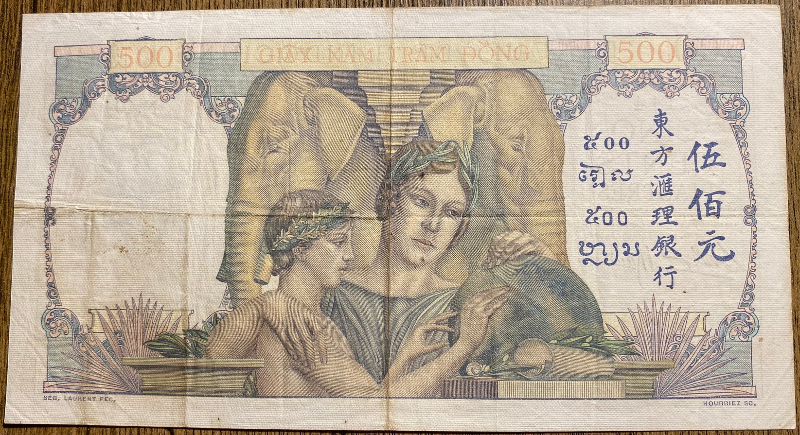 500 Piastres (1939) (Front: Laureate woman with boy studying globe. Flowers. Back: Laureate woman with boy studying globe. Palm fronds. Elephants. Watermark: Head of Mercury (Hermes). Predominant colours: Multicolour. Designer: Sébastien Laurent. Engravers: Marguerite Dreyfus (Rita), Jules Piel (front); Georges Hourriez (back). Signatures: Marcel Borduge (Le Président); Paul Baudouin (Le Directeur Général). Security thread: N/a. Printing method: Intaglio. Issuer: Banque de l'Indochine. Date of Issue: 1939. Date of withdrawal: N/a. Legal tender: No. Total issue: N/a. Material: Cotton paper. Printer: Banque de France (BdF)) (Serial # N.10/0237114) (circulated) VF