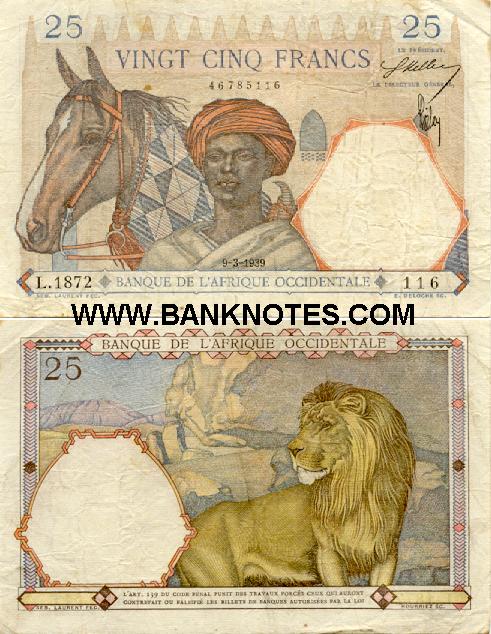 Texts: Banque de l'Afrique Occidentale. Vingt Cinq Francs. Twenty Five Francs. L'Article 139 du Code Pénal punit des Travaux Forcés ceux qui auront contrefait ou falsifié les billets de Banques autorisées par la loi.
