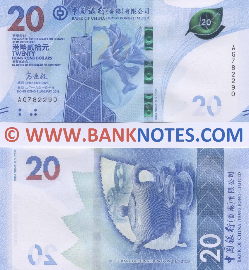 Texts: Bank of China (Hong Kong) Limited. Promises to pay the bearer on demand at its office here Twenty Hong Kong Dollars by order of the Board of Directors. Hong Kong 1 January 2018. |