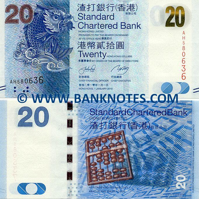 20 Dollars 1.1.2010 (Obverse: Mythical human-faced carp. Reverse: Heritage and technology: Abacus and binary code. Watermark: Multi-tonal Bauhinia flower; Electrotype '20'. Artist: Unknown. Engraver: Unknown. Main colour: Blue. Signature: Julian Fong Loong Choon (Chief Financial Officer 財政總監, 2000 – 31 August 2015); Benjamin Hung Pi Cheng (Chief Executive 行政總監, 2008–2014). Issuer: Standard Chartered Bank (Hongkong) Limited. Date of Issue: 1 January 2010. Withdrawn: N/a. Legal tender: Yes. Material: Cotton paper. Printer: Hong Kong Note Printing Limited (HKNPL) at Tai Po) (Serial Nos: AH5806xx) UNC