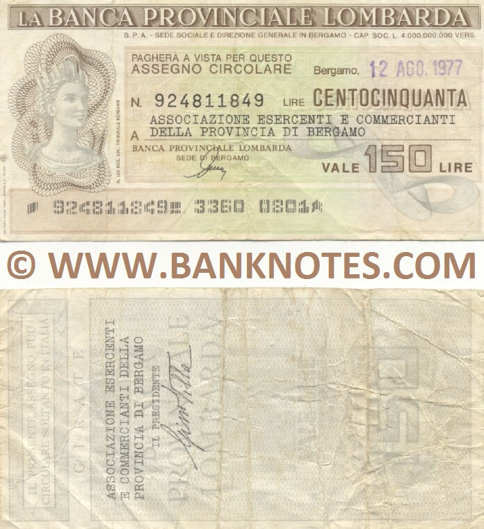 IT-BPL150 150 Lire 12.8.1977 (La Banca Provinciale Lombarda) VF 1.50 [Photo] [Add-to-Cart] (924811849) Sede di Bergamo