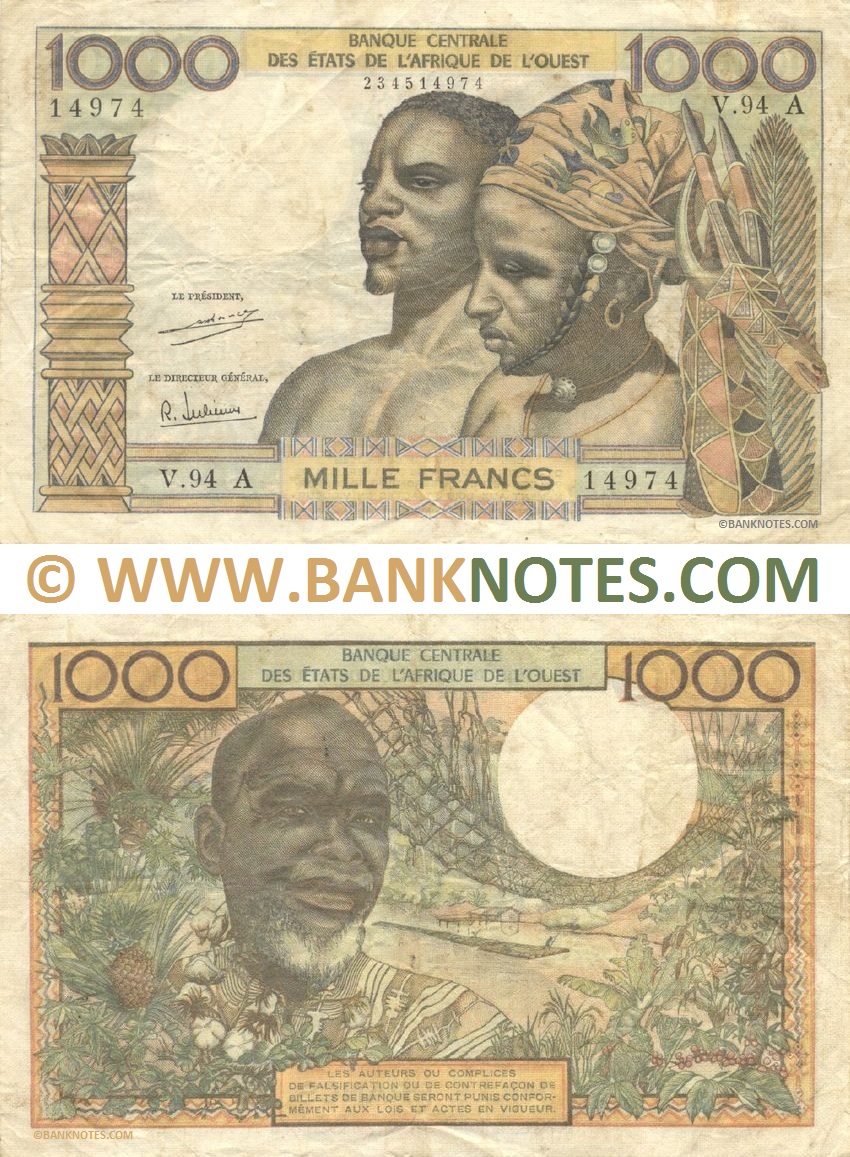 CI-103Ah 1000 Francs (1971) (Married couple; older man) aVF 45.00 [Photo] [Add-to-Cart] (V.94/234514974) Sig: Babacar Bâ; Robert Julienne