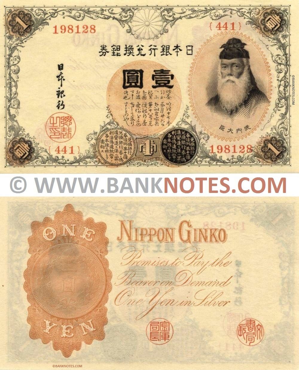 1 Yen (1916) First convertible silver yen banknote (Obverse: Portrait of Takeuchi no Sukune (臣大内武) (Born 84 AD). Stylised Sun – symbol of Japan (Land of the Rising Sun). Reverse: Silver One Yen 1874 coin within a guilloche rosette. An exchange clause. Red seals. Watermark: Leaves of Paulownia and vertical cursive Japanese characters 銀貨壹圓 in writing in white and black colour. Signatures: Signature seals on reverse: 金庫局長 (Director of the Treasury) and 文書局長 (Director of Documents). Main colours: Black and light orange. Artist: Edoardo Chiossone (1833–1898). Issuer: Bank of Japan (Nippon Ginko). Date of issue: 15 August 1916. Legal tender: Yes. Date of withdrawal: 1 October 1958. Material: Cotton fiber paper. Printing method: Intaglio. Printer: Printing Bureau of the Imperial Japanese Government (国立印刷局)) (Serial Nº 198128; Block Nº {441}) UNC