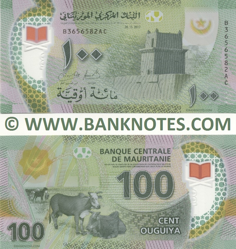 | Front: Oualata mosque. Back: Zebu cattle, sheeps and goats. Security features: Consecutively running black horizontal and vertical serial numbers on the obverse of the banknote. Some parts of banknote fluoresce under ultraviolet light. Artist: Unknown. Main colour: Green. Signatures: Sig.14 (R2L): Abdel Aziz Ould Dahi (Governor BCM, January 2015 to January 2020); Mohamed Ahmed Sidna (Chief Cashier). Issuer: Central Bank of Mauritania. Date of Issue: 28 November 2017. Material: Polymer plastic substrate. Printer: Canadian Bank Note Company, Ottawa (CBNC). |