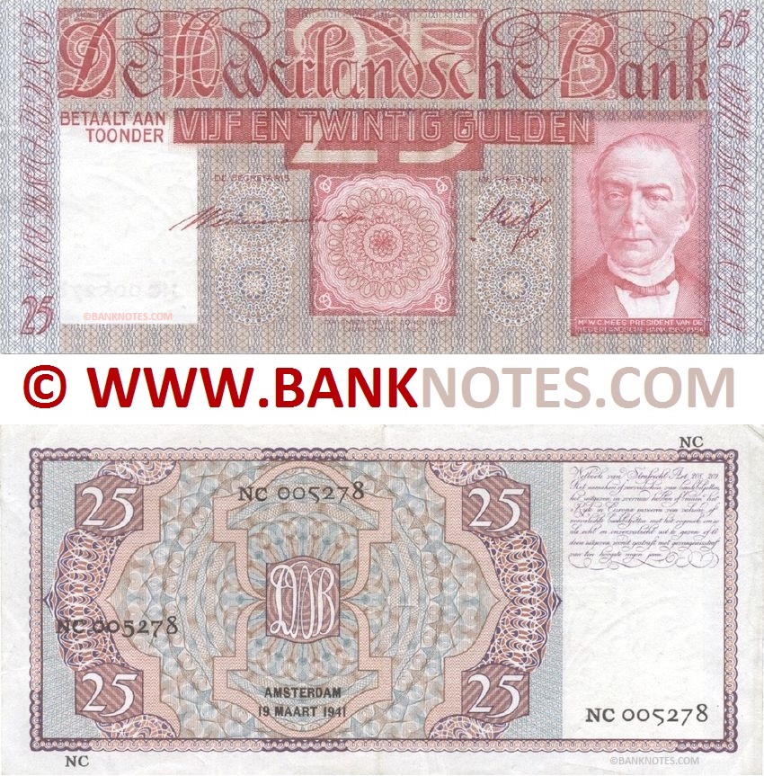 25 Gulden 11.5.1934 (Front: Portrait of Willem Cornelis Mees (1982–1970), President of the Bank of the Netherlands (1863–1884). Denomination rosettes and guilloche patterns. Back: DNB bank logo. Denomination rosettes and guilloche patterns. Watermark: Head of Greek god Hermes (Roman god Mercury) in profile. Main colours: Red and brown. Artist: Carel Adolph Lion Cachet (1864-1945), Fec. Signatures: Jan Westerman Holstijn (De Secretaris, De Nederlandsche Bank, 1933–1941); Leonardus Jacobus Anthonius Trip (De President, De Nederlandsche Bank, 1931 – March 1941 and 7 May 1945 – 30 April 1946). Issuer: De Nederlandsche Bank. Date of Issue: 11 May 1934. Material: Cotton paper. Printing method: Offset. Printer: Joh. Enschedé en Zonen, The Netherlands (JEZ)) (Serial # BB 057429) (circulated, without edge tears) F-VF