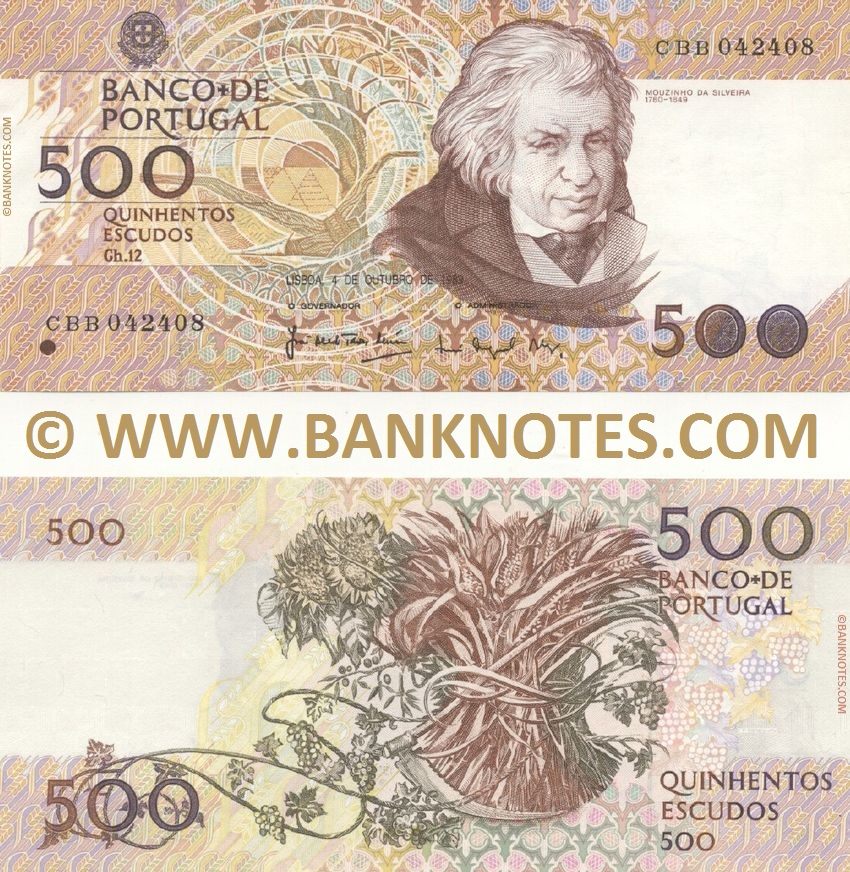 500 Escudos 13.2.1992 (Obverse: Effigy of José Xavier Mouzinho da Silveira (Castelo de Vide, 12 July 1780 – Lisbon, 4 April 1849). Portuguese coat of arms (Armillary sphere + the quinas + the castles). Rising sun and a tree. Reverse: Scythe in a corn and wheat sheaf with sunflowers, grapes and grape vines. Watermark: Identical portrait of Mouzinho da Silveira. Predominant colour: Brown. Date on the banknote: 13 February 1992. Artist: Prof. Luis Filipe de Abreu. Engraver: Alan Dow. Signatures: José Alberto Tavares Moreira (Governor – O Governador); António Mendo Castel-Branco Borges (Vice-Governor – O Vice-Governador). Issuer: Banco de Portugal. Redeemable until: 1 May 2018. Material: Cotton fiber paper. Printer: Thomas De La Rue & Company, Limited, England (TDLR)) (Serial # CCQ 576777) UNC-