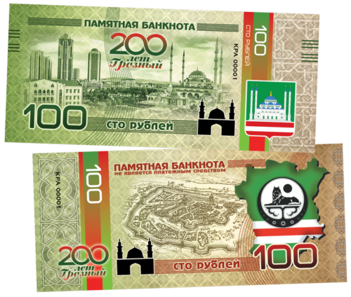 Texts: Грозный – 200 лет. Сто Рублей. Памятная банкнота. Не является платёжным средством.