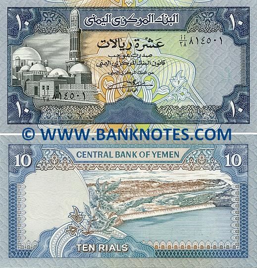 in Sana'a. Reverse: Marib Dam in the valley of Dhana, near the ruins of the Great Dam of Marib; Arabian coffee shrub (Coffea arabica). Watermark: Coat of Arms depicting a golden eagle. Signature: Muhammad Ahmad Al-Junaid (Governor of the Central Bank, in office 1985-1994). |