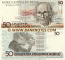 50 Rials (1973) (Obverse: Bronze statue of Ma'adkarib "Bronze man" found in Al Baydah (ancient Nashqum), now in Louvre Museum in Paris, France. Reverse: Bab Al-Yemen Gate in Sana'a. Watermark: Coat of Arms depicting a golden eagle. Signature: Abdulla Mohammed Al-Sanabani (Governor & Chairman of the Central Bank)) (Serial # 1/76 005979) UNC