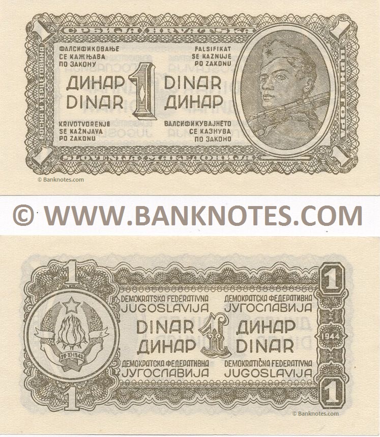 1 Dinar 1944 (Front: Cameo depicting a Yugoslav "partizan" soldier with rifle over his shoulder. Back: Coat of arms. Watermark: Curved lines pattern. Signatures: None. Main colour: Olive-brown. Security features: Watermark. Issuer: Democratic Federal Republic of Yugoslavia. Date of Issue: 1944. Date of withdrawal: 1946. Demonetized: 1 July 1956. Designer: Đorđe Andrejević Kun. Legal tender: No. Total emission: No info. Material: Cotton fiber paper. Printing method: Intaglio. Printer: National Bank of Yugoslavia - Banknote and Coin Printing & Minting Factory, Belgrade (Zavod za izradu novčanica i kovanog novca – Завод за израду новчаница и кованог новца, 1 December 1929–)) (thick paper, without security thread)